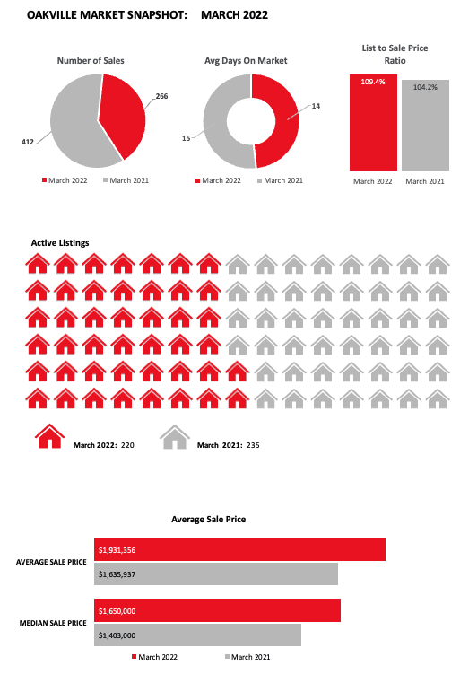 Here is a snapshot of the Oakville real estate market for the month of March 2022 in comparison to March 2021, taking into account all property types: